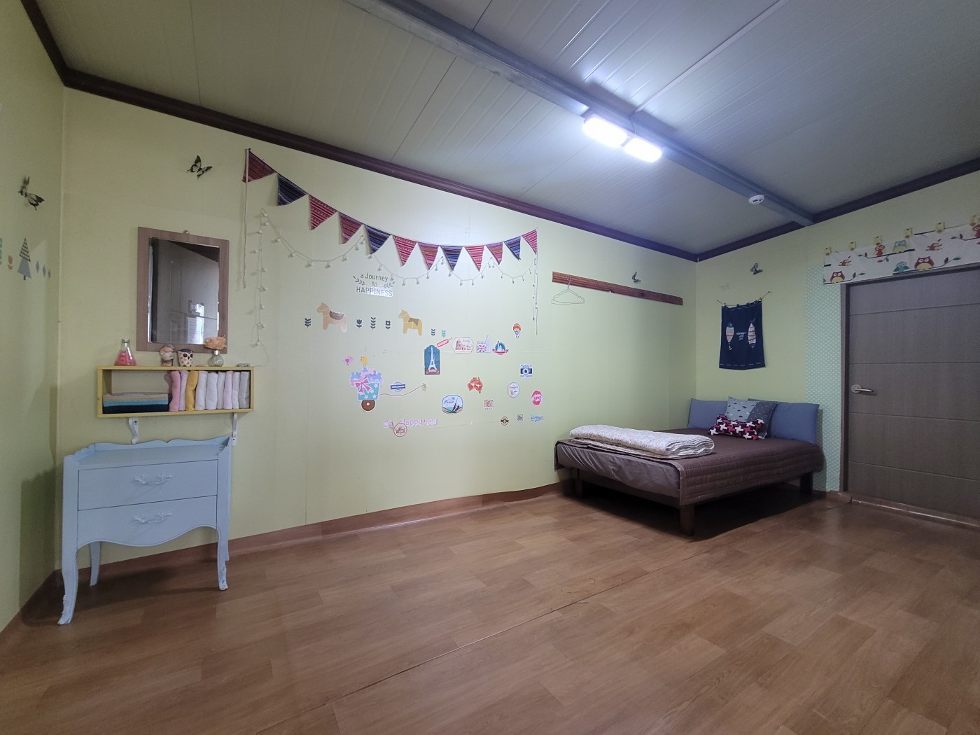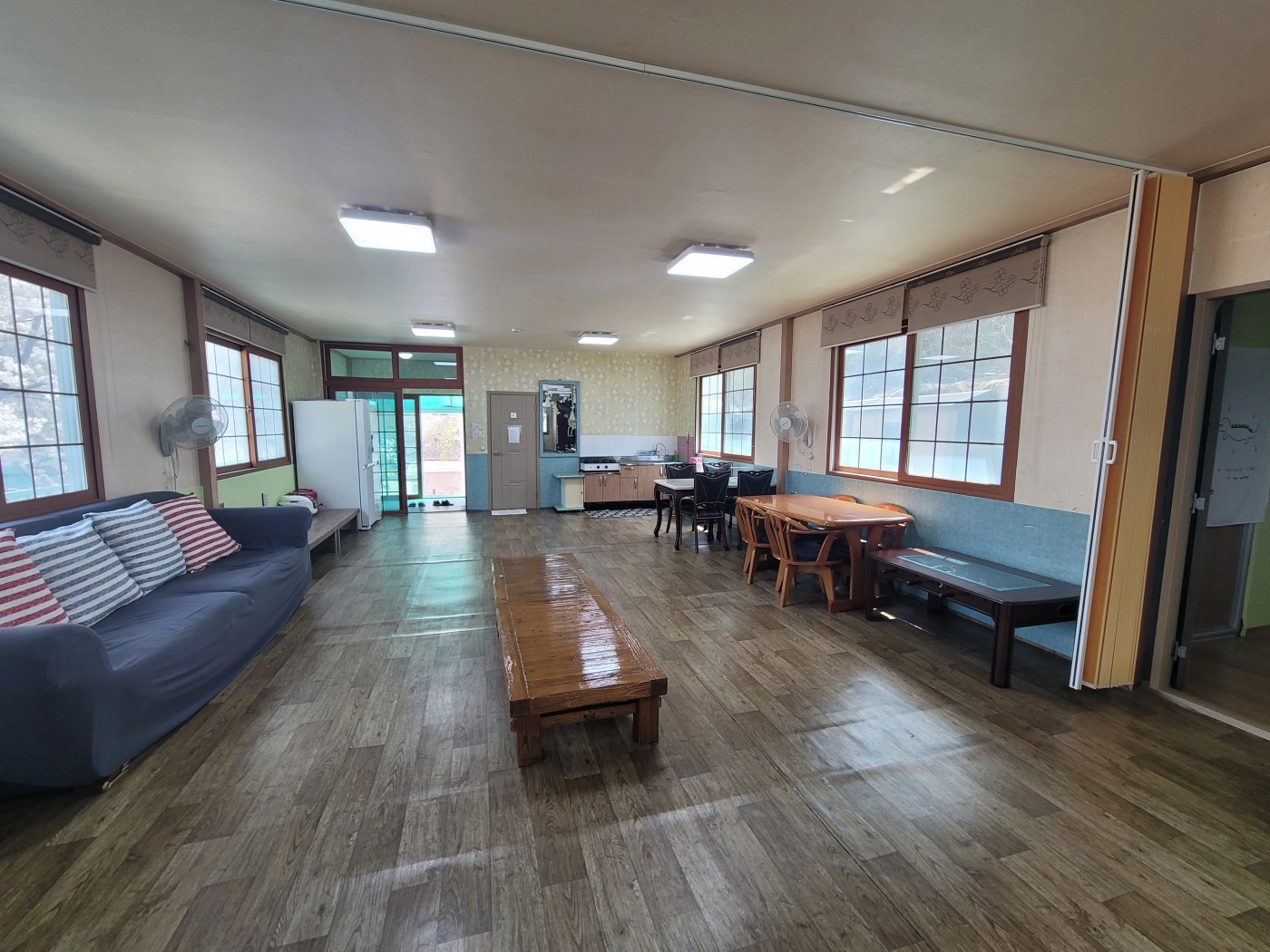 단체실 펜션의 객실 구조입니다. (대형룸, 작은방, 주방, 샤워실, 남녀 화장실)